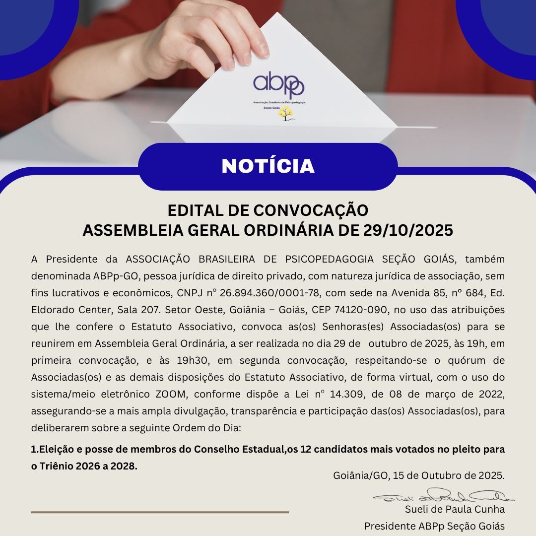 A ABPp Seção Goiás informa que o Edital de Convocação da Assembleia Geral Ordinária já está disponível!
